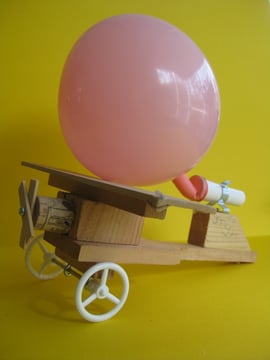 Op de basis plaat maken we de wieltjes en monteren het pijpje voor de ballon. Hoe jij verder je voertuig wilt maken is helemaal aan jou. Houd er rekening mee dat je ontwerp niet te zwaar gaat worden. Wat gebeurd er wanneer de asjes niet gelijk staan? Hoe realiseren wij dat de wielen niet aan ”lopen? Pak een ballon en racen maar!