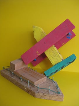 Hout, boormachine, spijkers, schroeven, papier, houtlijm en restmateriaal voor het opvrolijken.